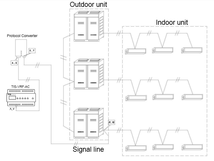 Connect the X and Y terminals of the Fujitsu protocol converter to the X1 and X2 terminals of the indoor or outdoor unit of the air conditioner. The A and B terminals of the Fujitsu protocol converter are connected to the X and Y terminals of the TIS-VRF-AC.